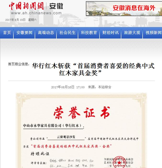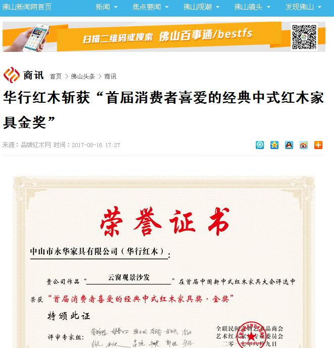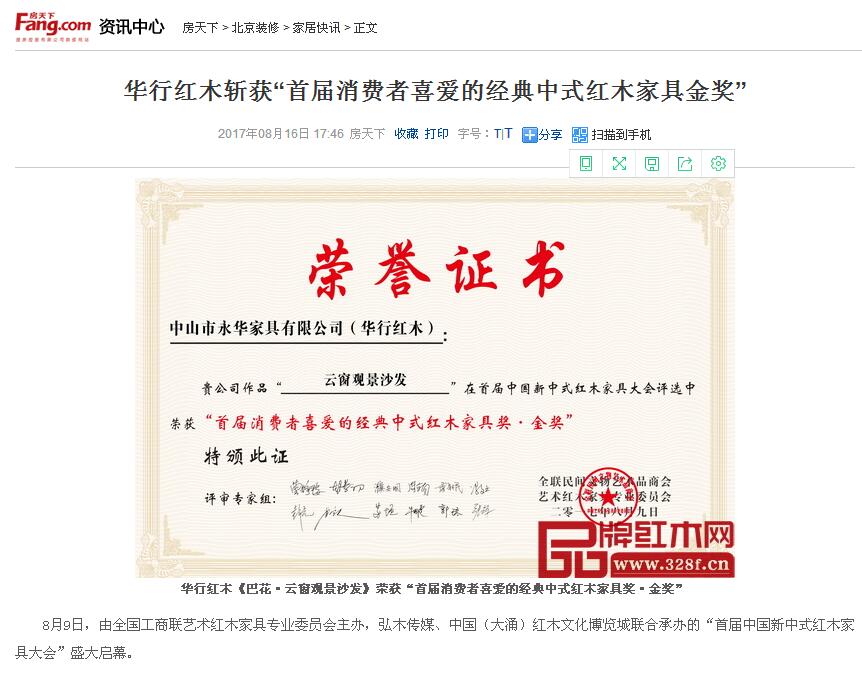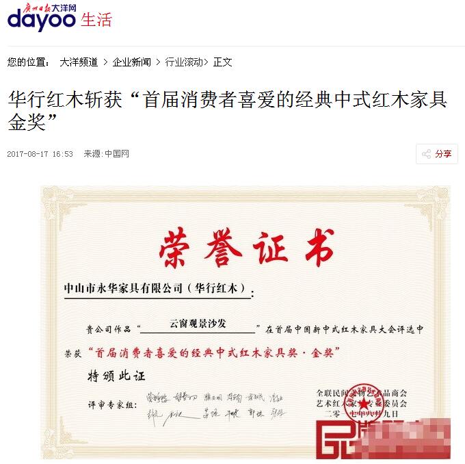 華行紅木《巴花·云窗觀景沙發》榮獲“首屆消費者喜愛的經典中式紅木家具獎·金獎” 8月9日,由全國工商聯藝術紅木家具專業委員會主辦,弘木傳媒、中國(大涌)紅木文化博覽城聯合承辦的“首屆中國新中式紅木家具大會”盛 [更多信息]